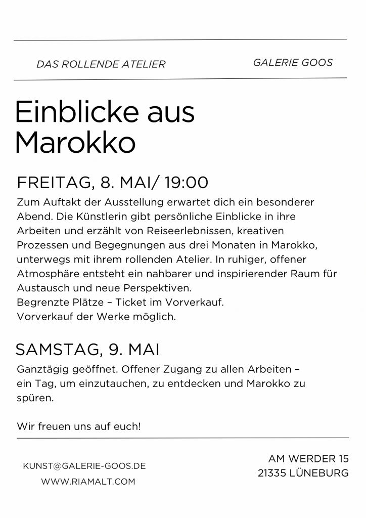 Ich freue mich sehr, euch mitteilen zu können, dass ab sofort eine Auswahl meiner Werke in der neu eröffneten Galerie Goos in Lüneburg zu sehen ist. Die Galerie zeigt unter anderem zeitgenössische Kunst in einem offenen und inspirierenden Rahmen, und ich bin dankbar, ein Teil davon zu sein. Ausgestellt sind sowohl neue Arbeiten als auch einige meiner persönlichen Lieblingswerke.